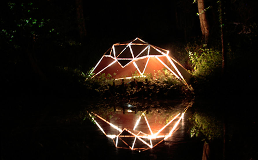 De dag-nacht sequentie is zeer bepalend. Overdag zie je de duidelijke houten facetten, 's nachts lichten alle knooppunten en ribbes op. Zo bereiken we 's nachts een vectoriële constructie van licht.